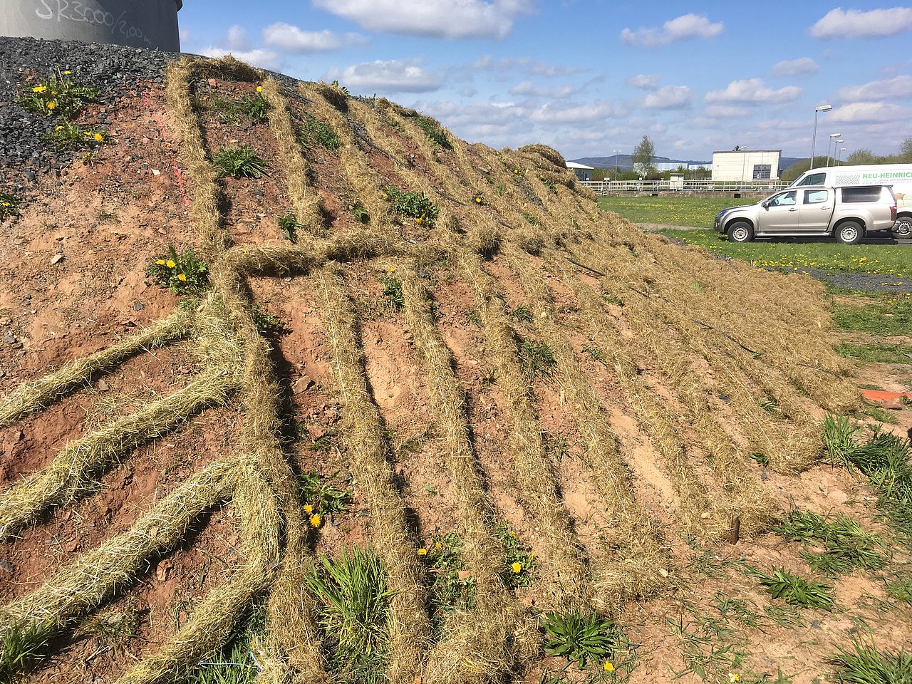 Die Heustränge sind vielseitig einsetzbar, u.a. als Erosionsschutz, zur Wasserspeicherung oder um Bergbaugebiete zu renaturieren. Diese Einsätze erfolgen mobil und direkt vor Ort. Neben der Befestigung von Hängen gegen Erosion helfen die Heustränge bei der Begrünung der Hänge. Gras- und Kräutersamen fallen aus den Heusträngen aus und keimen. Wichtig ist Meusel, dass das Heu direkt vor Ort gewonnen werden kann und damit gebietsheimische Pflanzensamen übertragen werden. Die Samen aus dem Heu in unmittelbarer Nachbarschaft wirken der Veränderung von Floren entgegen und die Verbreitung von gebietstypischem Samen in der jeweiligen Region wird gefördert. Ein wichtiger Beitrag zum Artenschutz. Das ist mit der mobilen Maschine möglich.